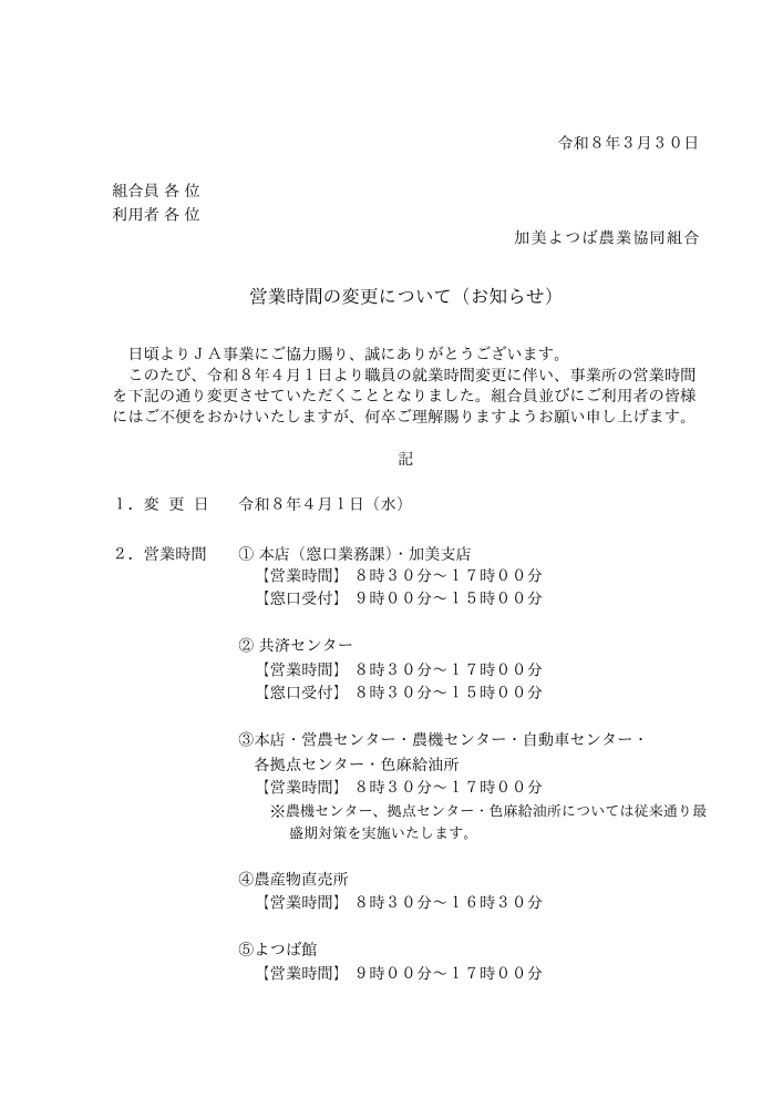 JA加美よつば営業時間の変更について(お知らせ)|JA加美よつば